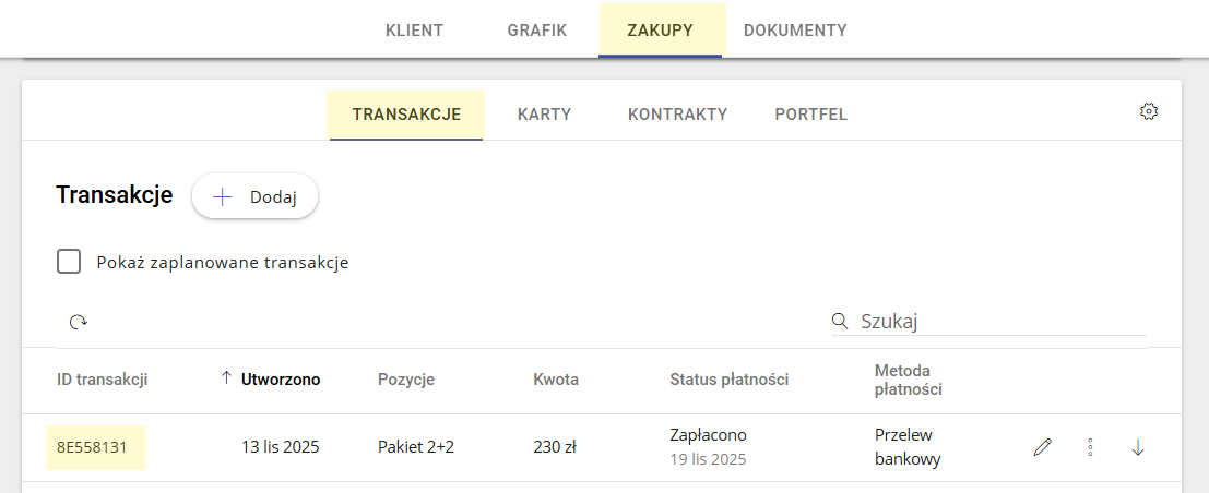 2. Przejdź do działu Zakupy > Transakcje w profilu klienta.