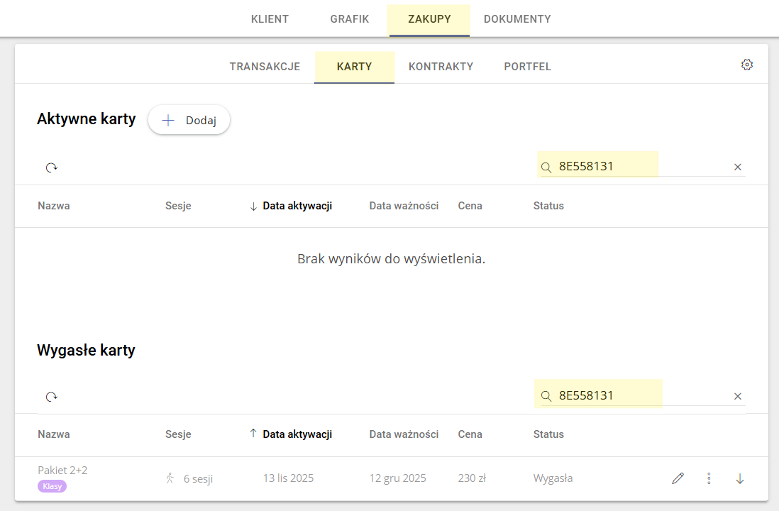 3. Przejdź do działu Karty w profilu klienta i wklej skopiowany numer ID w polu wyszukiwania Aktywnych lub Wygasłych kart.