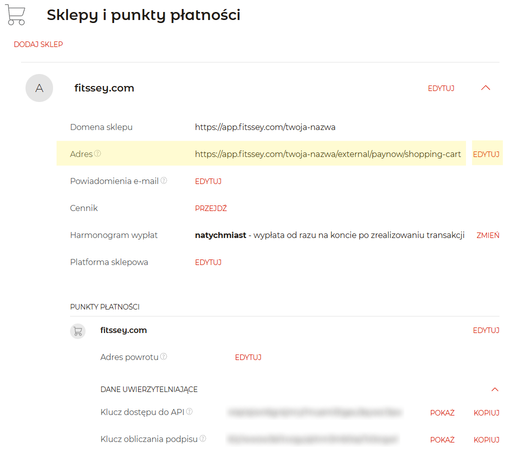 6. Kliknij utworzony wcześniej sklep, aby rozsunąć panel z informacjami, a następnie uzupełnij pole Adres wpisując adres powiadomień, który znajdziesz w dziale Studio > Metody płatności > Paynow w Fitssey: